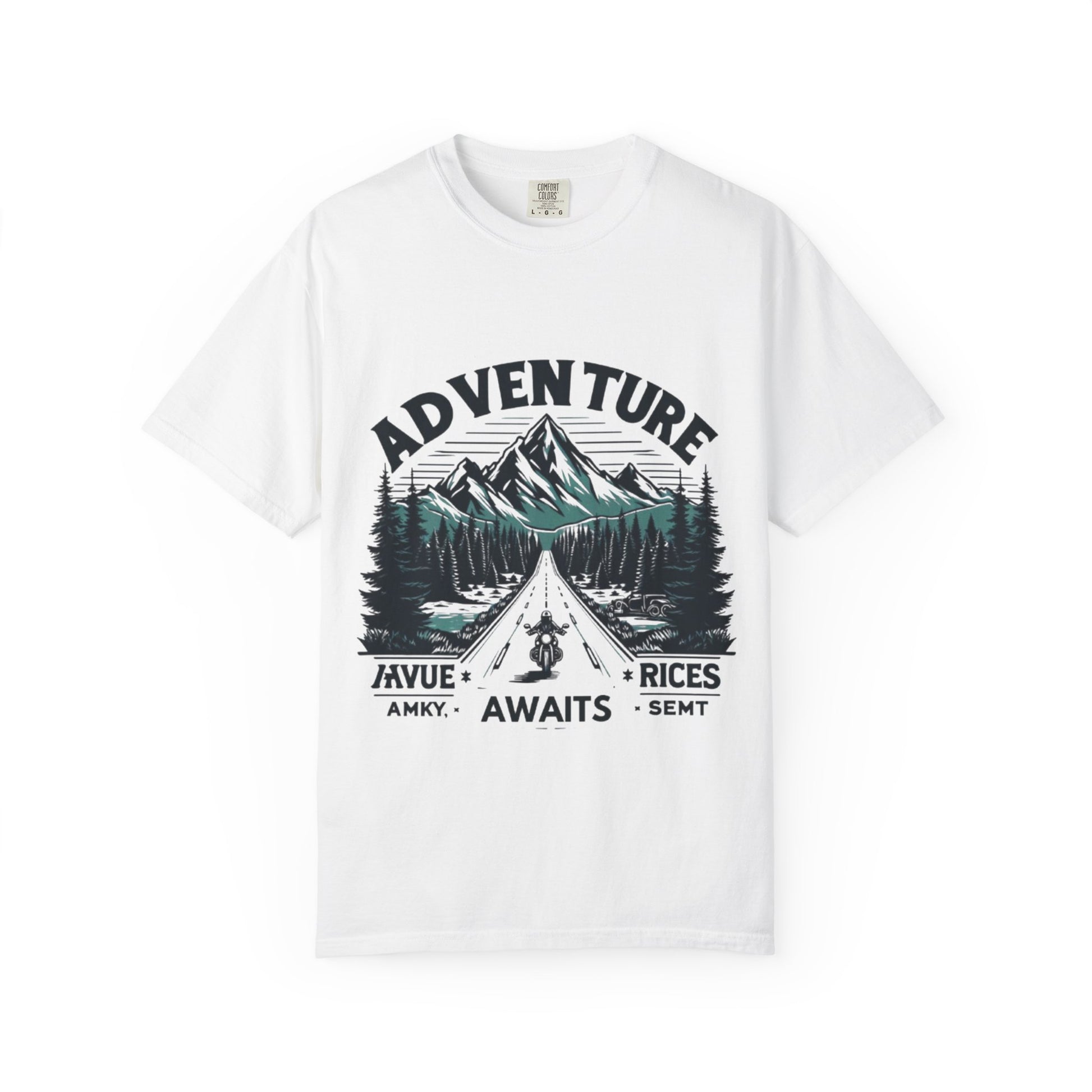 Hit the open road with purpose in this vintage-style motorcycle T-shirt featuring a rugged mountain landscape, pine forest trails, and a lone biker riding toward adventure. With the bold phrase “Adventure Awaits”, this design captures the soul of freedom, grit, and the untamed spirit that defines every true rider.