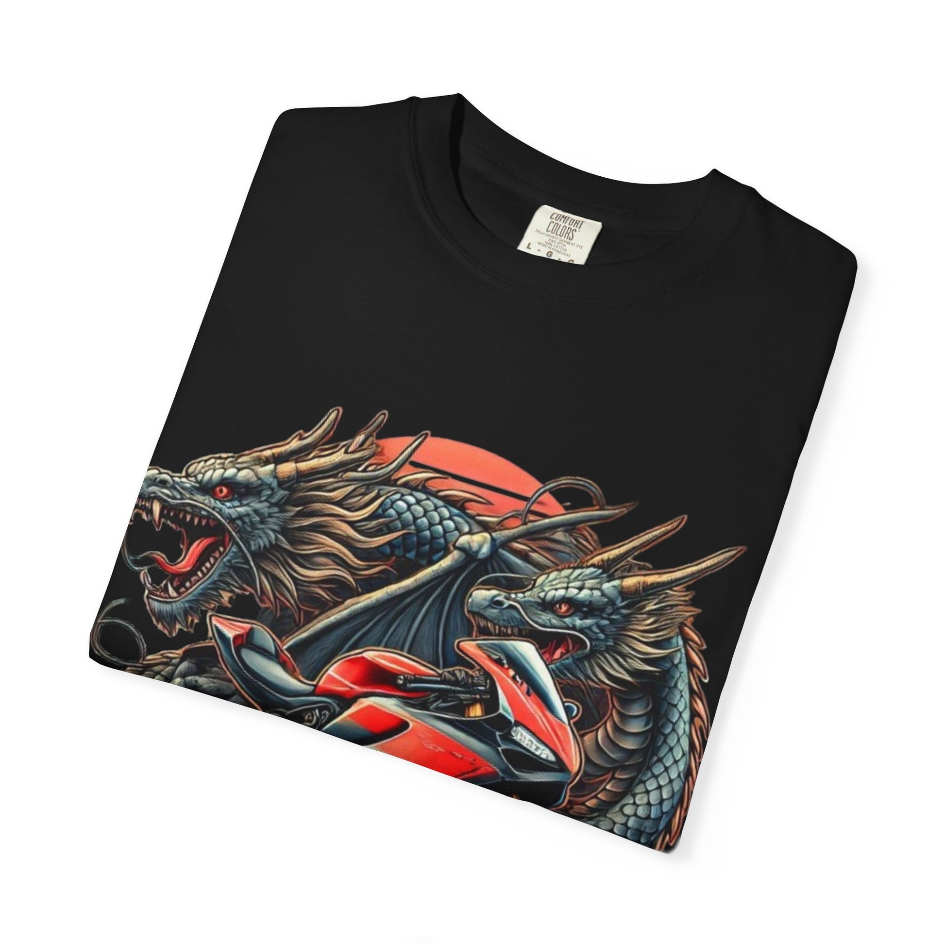 Unleash the ultimate power duel with our Ducati Panigale-inspired motorcycle T-shirt, featuring an electrifying showdown between a sleek Ducati superbike and ferocious dragons. This graphic masterpiece is a bold tribute to the fire-breathing performance of the Ducati Panigale V4 and Panigale V2, designed for riders who dare to ride with fury.