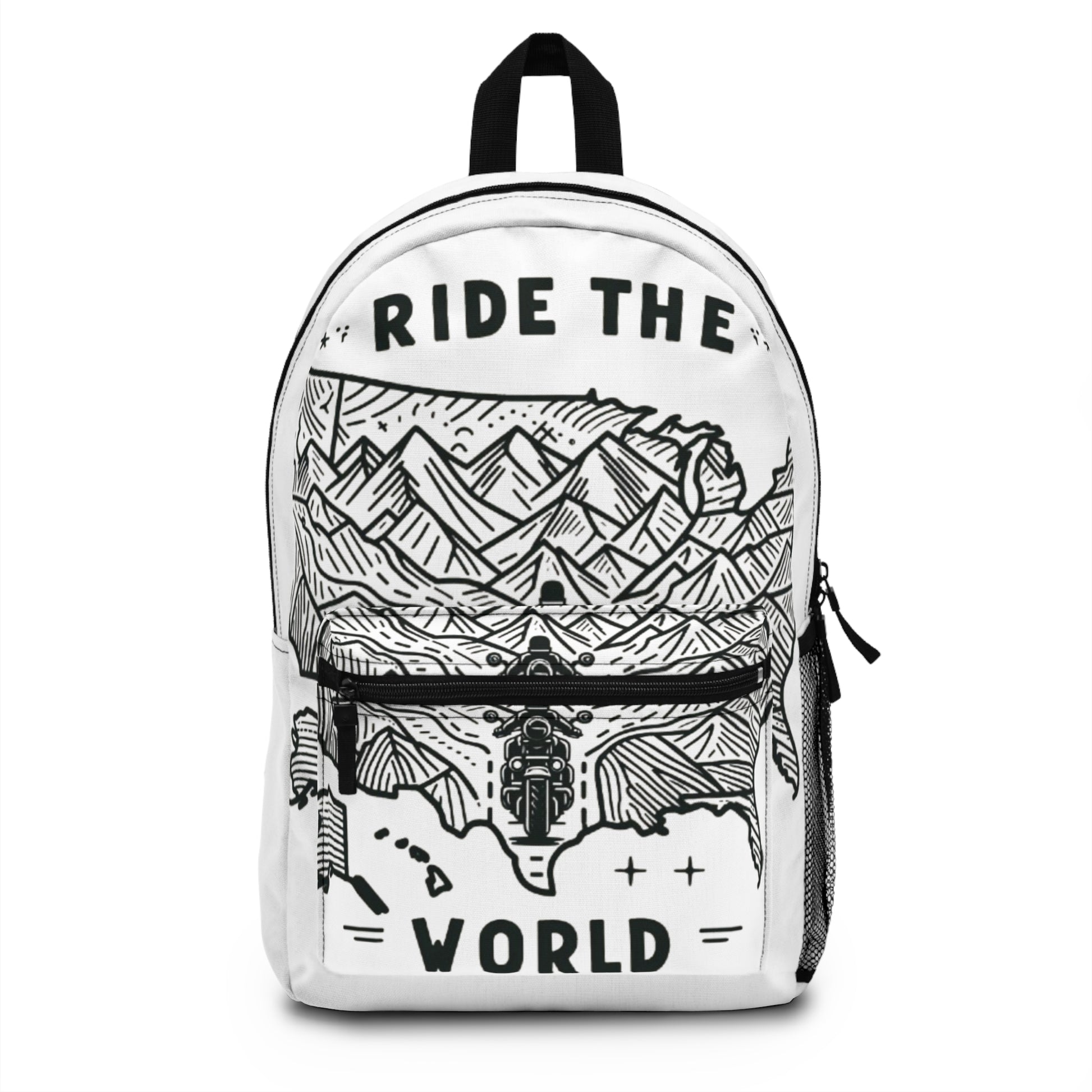 Explore every highway, canyon, and coast with this bold vintage-style motorcycle BackPack featuring a detailed map of the USA with rugged mountains and a fearless biker heading straight into the wild. The powerful “Ride the World” slogan captures the spirit of those who live to travel on two wheels.